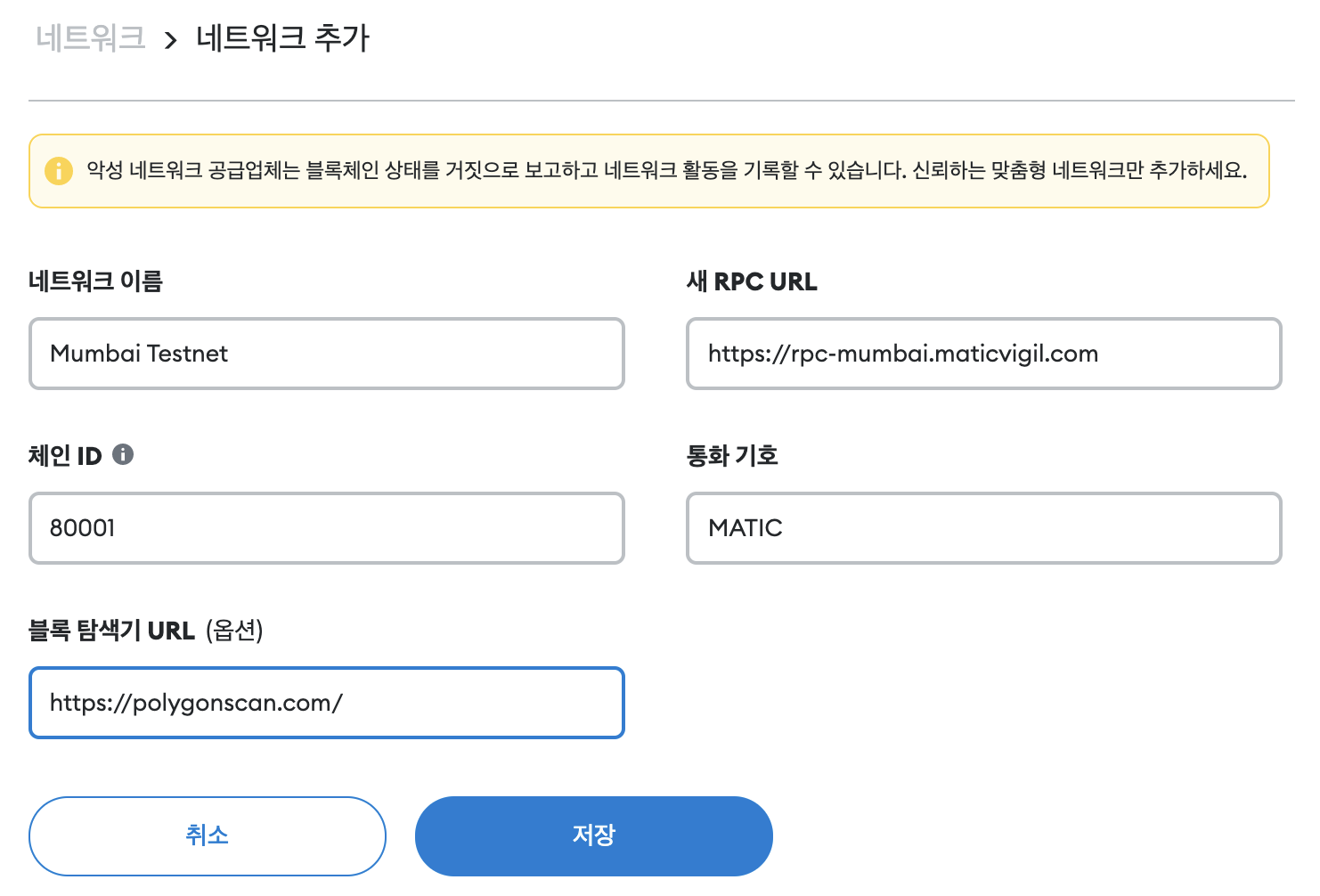 뭄바이(Polygon) 테스트넷 연결: 메타마스크 > 네트워크 추가
